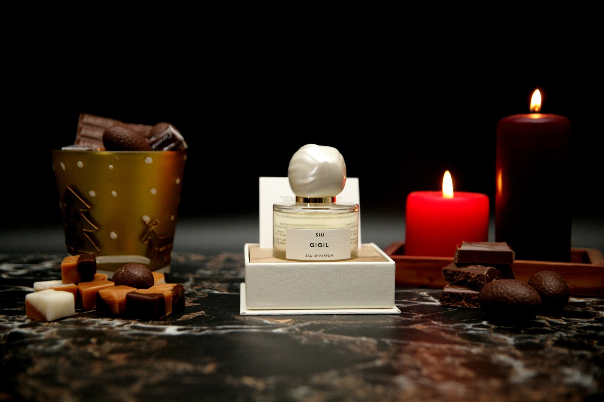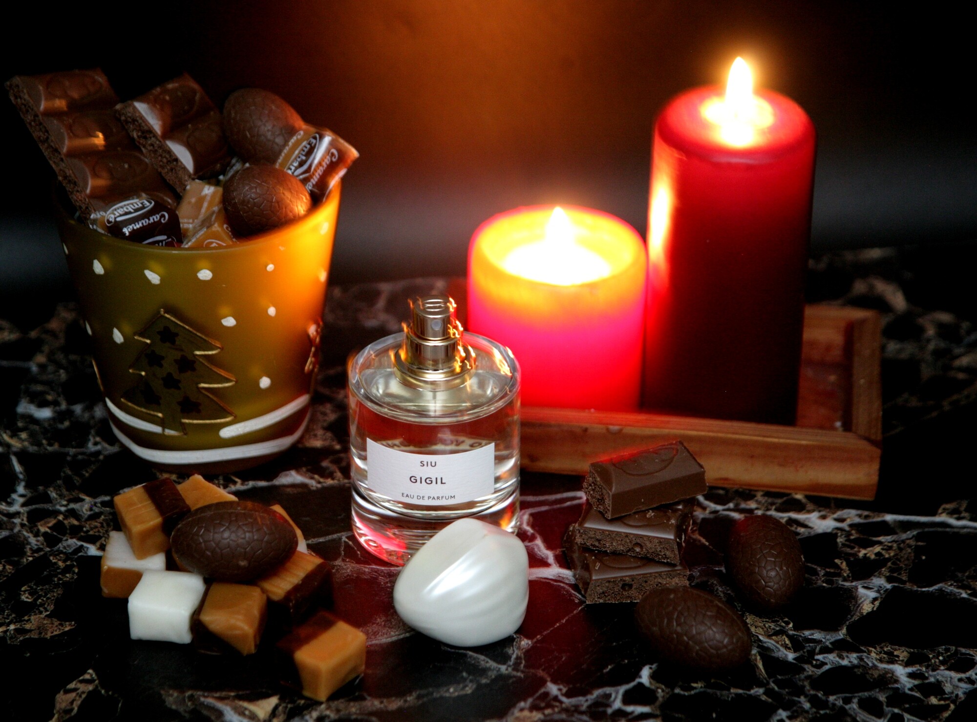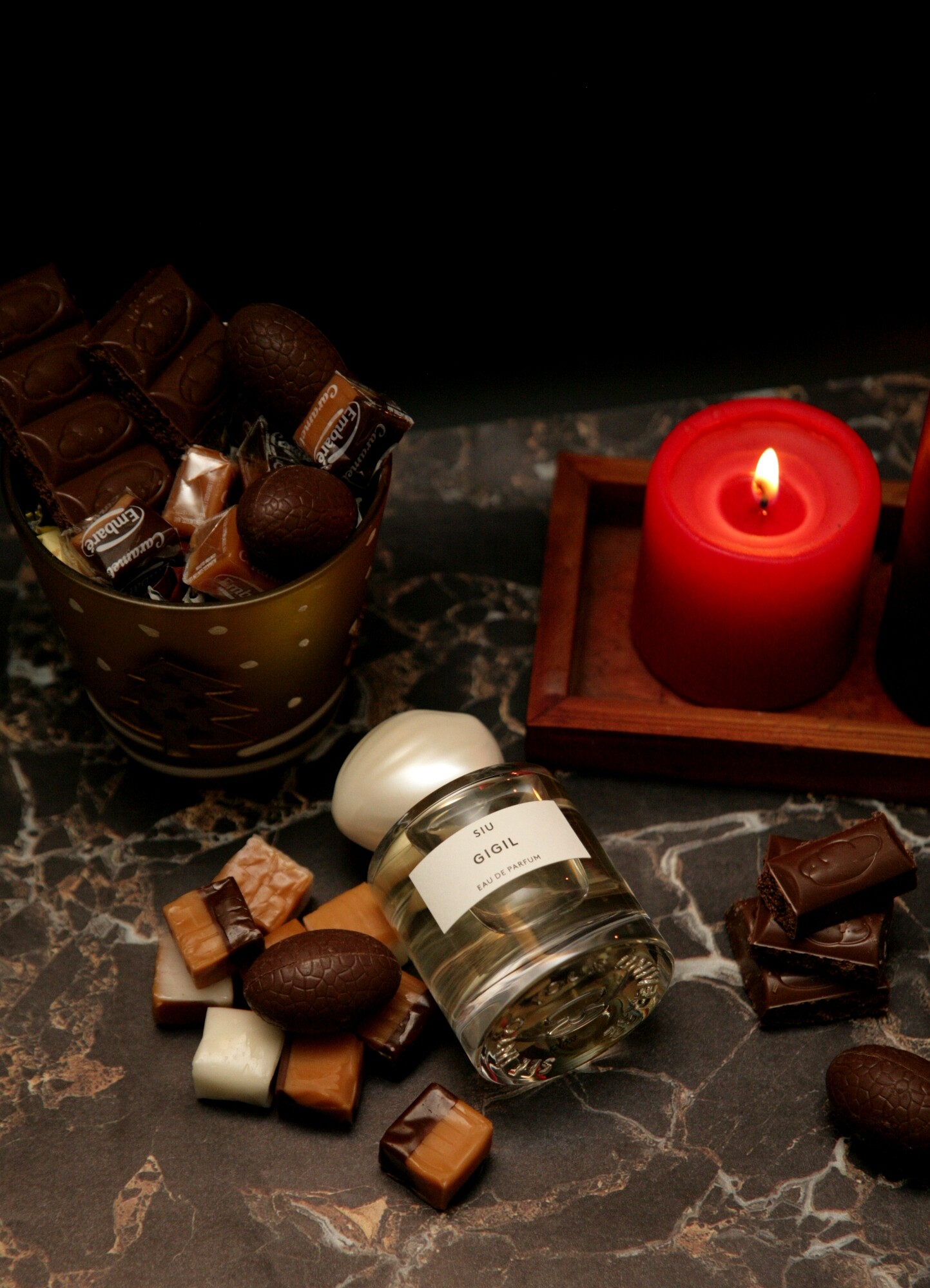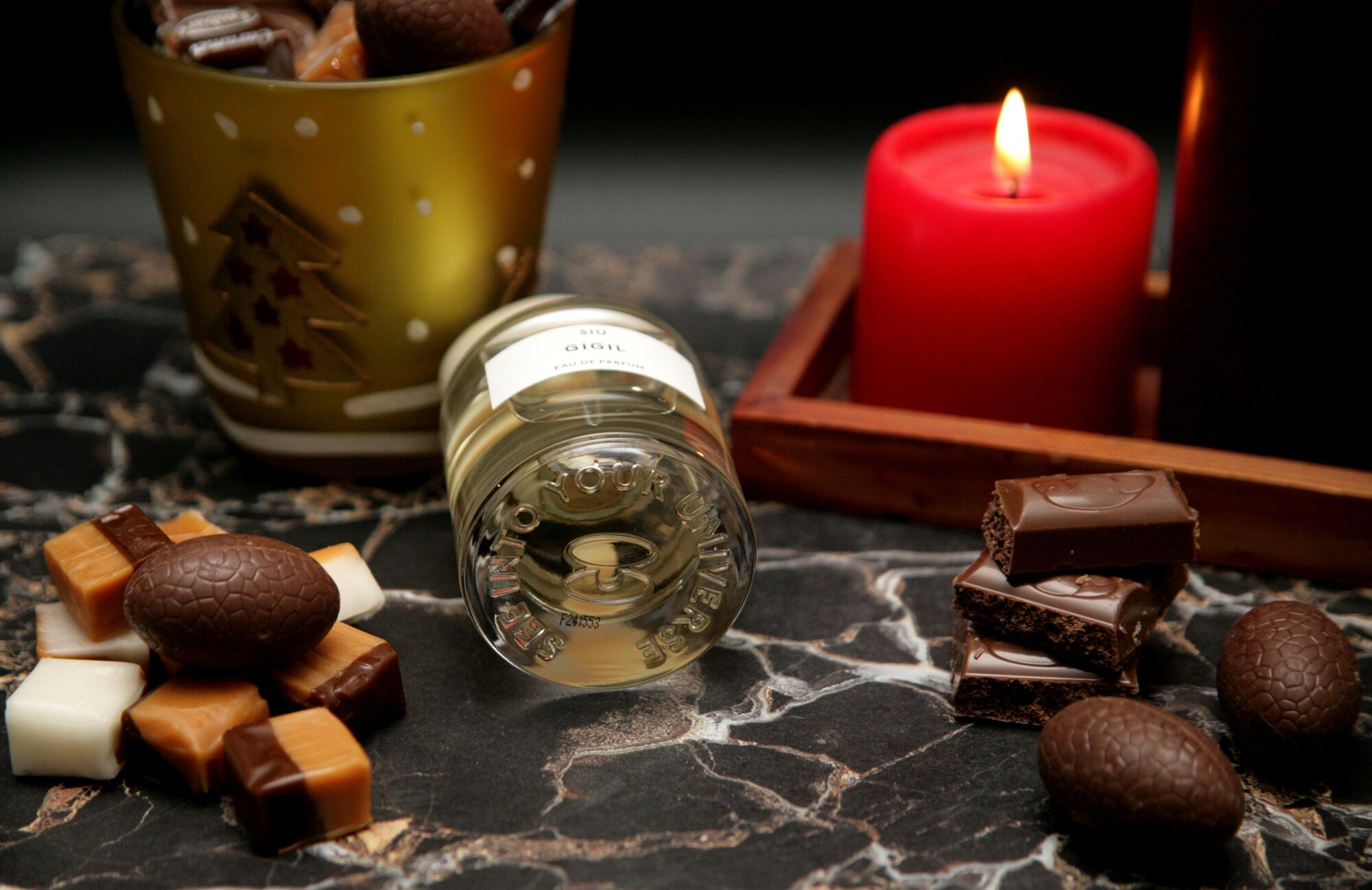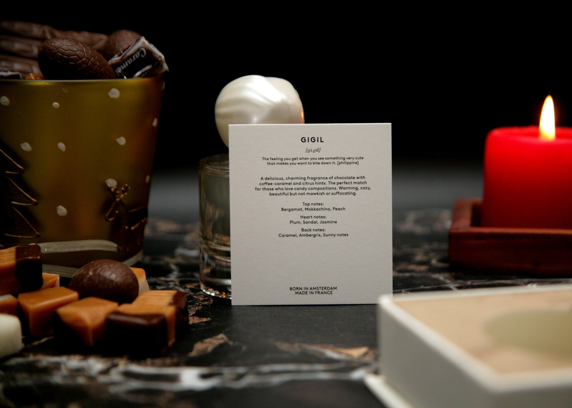 Gigil стартует ярко и уверенно - бодрящими цитрусовыми нотами с акварельным персиком, но цитрусы и персик солируют буквально мгновение, спустя минуту другую аромат заслащивается и теплеет. Позже он уже шоколадно-кофейный, с большим количеством молока, вернее сгущенки, сладко... Но сладость не приторная, цитрусовые ноты вносят бодрые акценты, хотя и не выделяются из общего звучания аромата.
