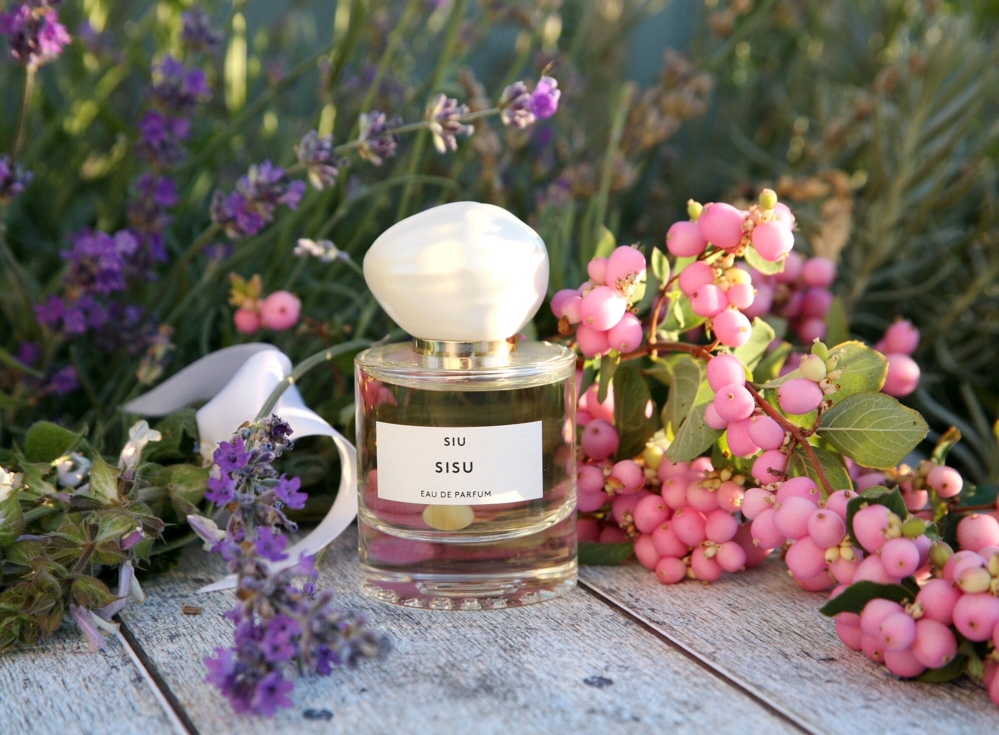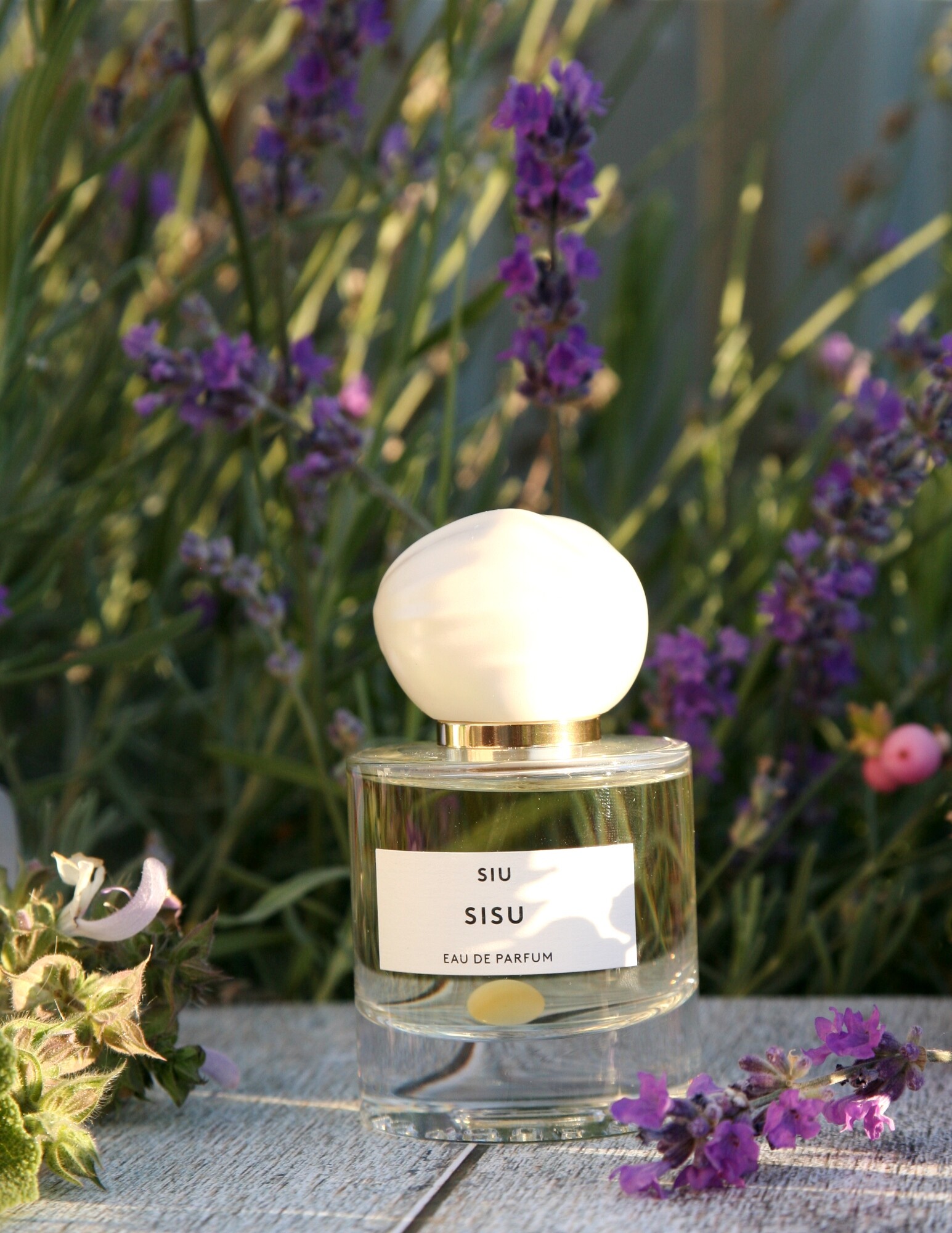 После длительного знакомства лаванда в шоколаде, или лавандовый шоколад, стал основной ощутимой нотой в Sisu, белых цветов мне не положили, зато шалфей яркий и узнаваемый. На фотографии, перевязанный белой лентой, как раз и лежит букет мускатного шалфея, и при параллельном затесте его аромат отлично вычленяется из общей композиции. Он яркий, свежий, слегка прохладный, с легкой мятностью. Именно нота шалфея разбавляет сладость и пудровость аромата.