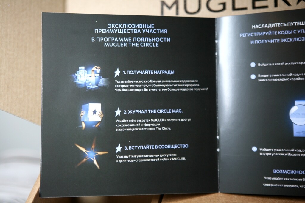 Бренд Mugler умеет привлечь внимание публики: своим эпатажными нарядами, роскошными ароматами и потрясающе красивыми флаконами. Но помимо всего этого у него очень "лояльная" программа лояльности) Ну какой еще бренд будет дарить подарки за преданность марке. Думаю что каждый, хоть единожды купивший аромат Mugler, обращал внимание на конвертик с надписью The Circle и кодом под крышкой коробки. Я даже пыталась зарегистрироваться на оф. сайте бренда и регистрировала там эти коды, но так до конца ничего и не поняв забросила это. Программа лояльности на тот момент была недоступна для нашей страны.