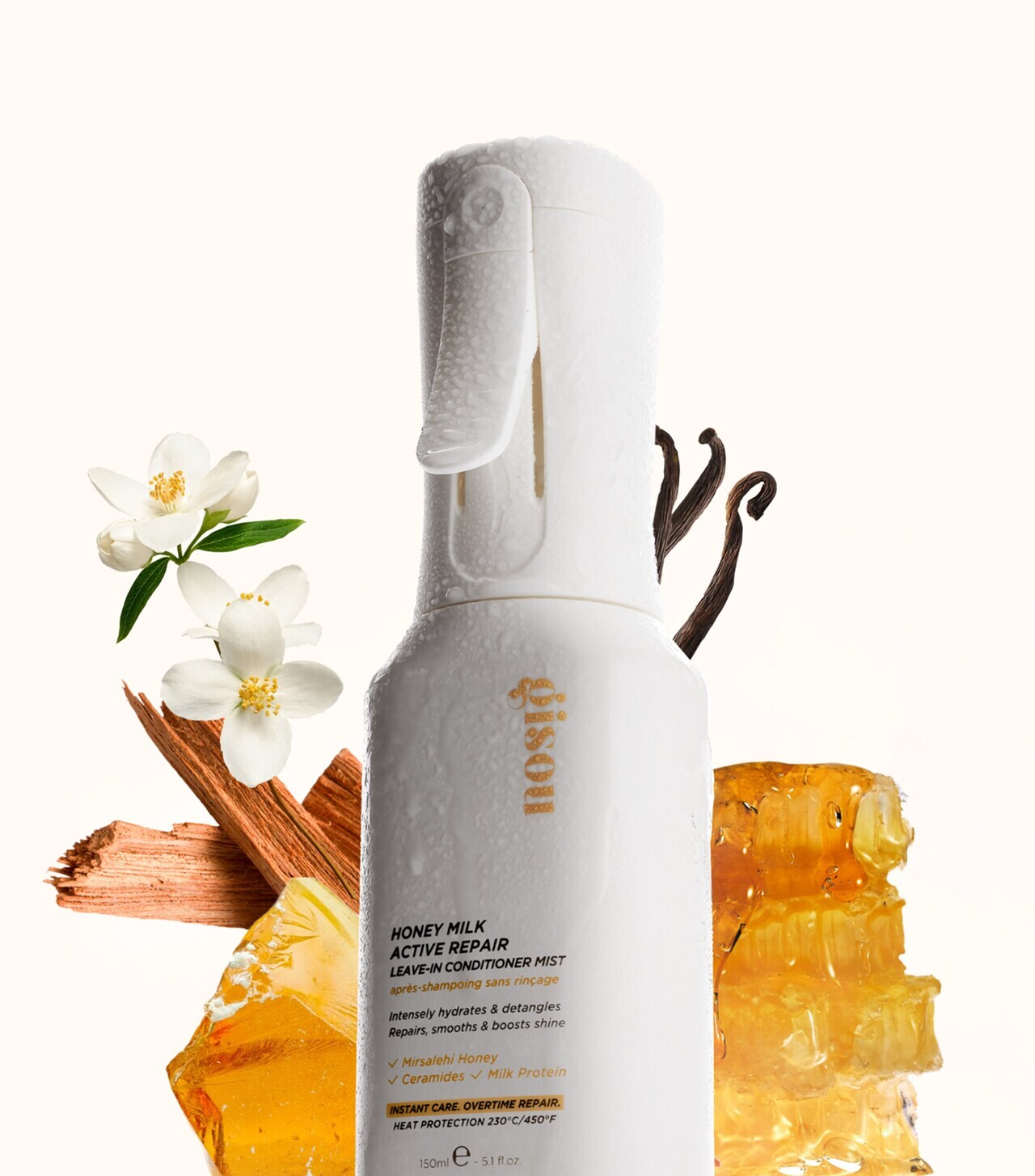«Лёгкий, как молоко, и насыщенный, словно мёд – этот ультрадисперсный мист активно восстанавливает волосы, действуя снаружи и изнутри. Научно доказано: инновационная формула реконструирует и защищает структуру волос на молекулярном уровне, сохраняя целостность кератина. Одновременно с этим мист глубоко увлажняет, дисциплинирует пушистые пряди и придаёт волосам зеркальный блеск», – Gisou.