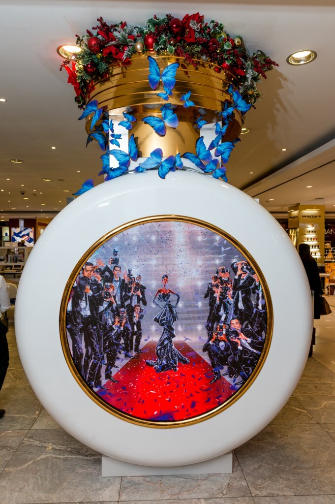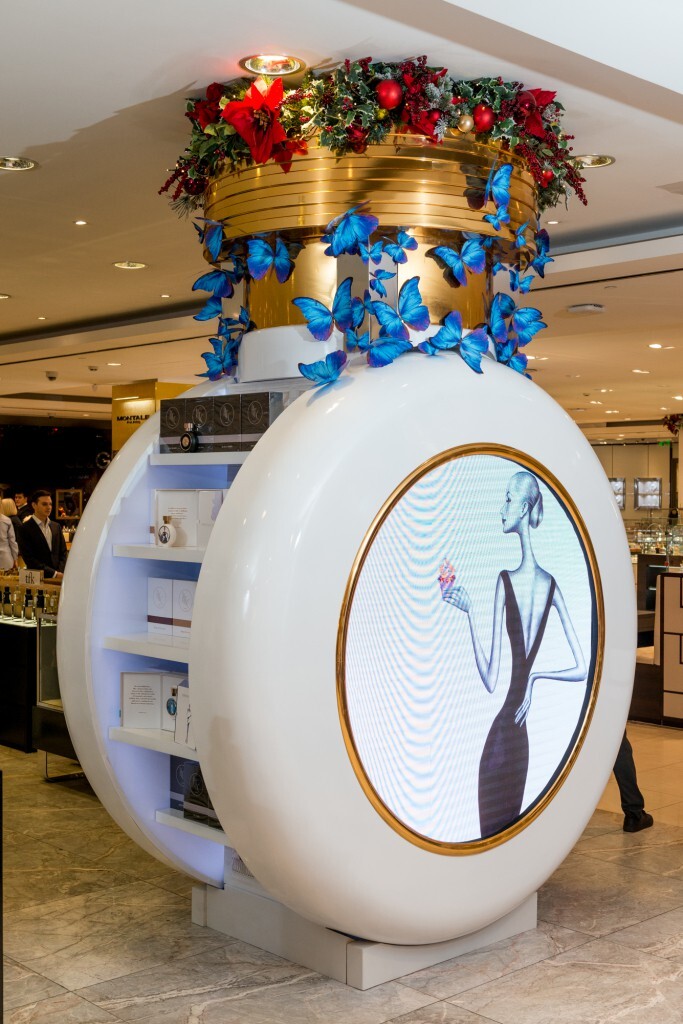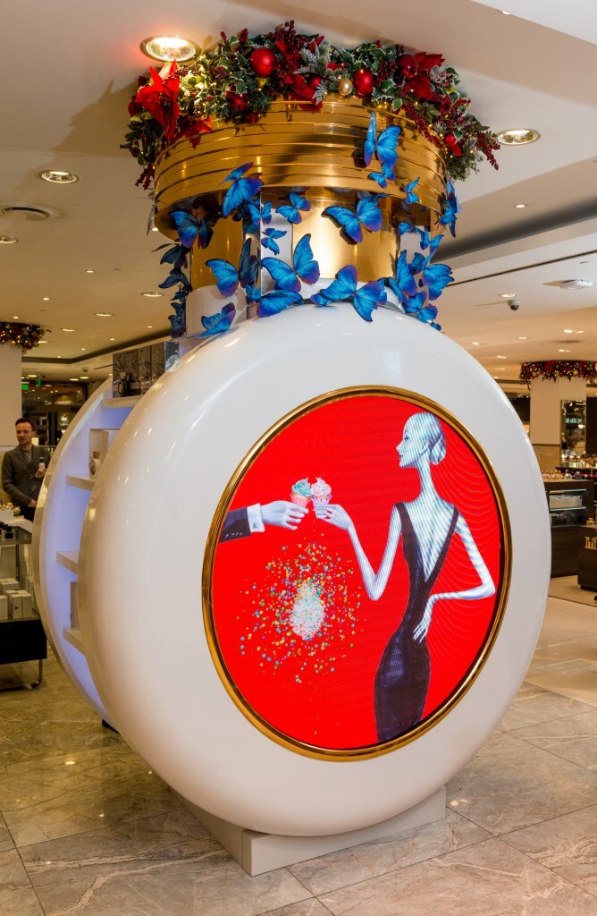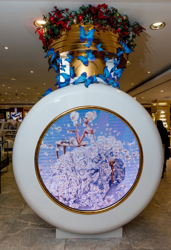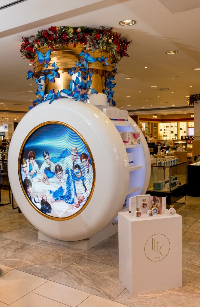 Украшенная объёмными аппликациями в виде бабочек и новогодними игрушками инсталляция в виде большого флакона HFC также оснащена экраном, на котором транслируется красочный рекламный фильм.