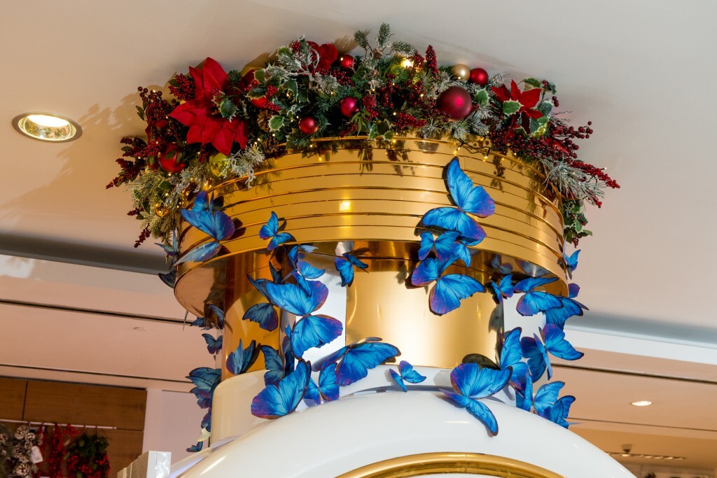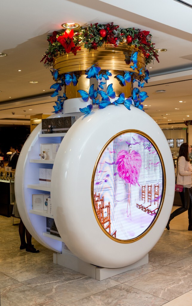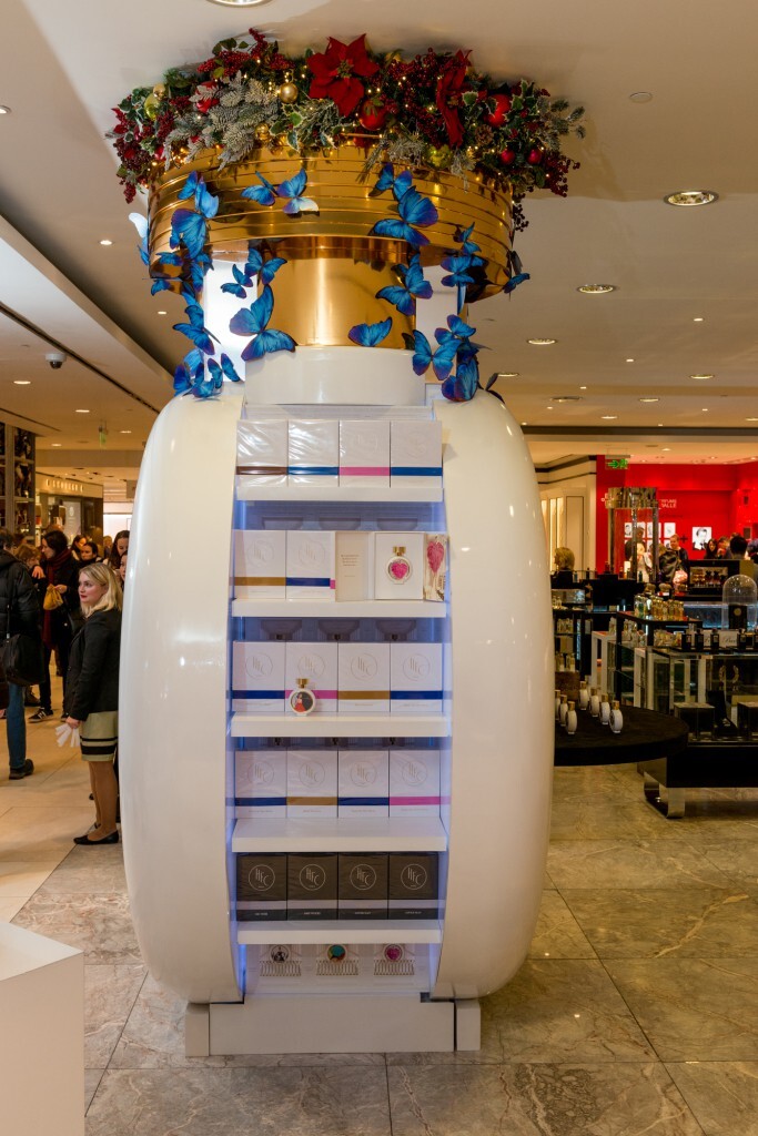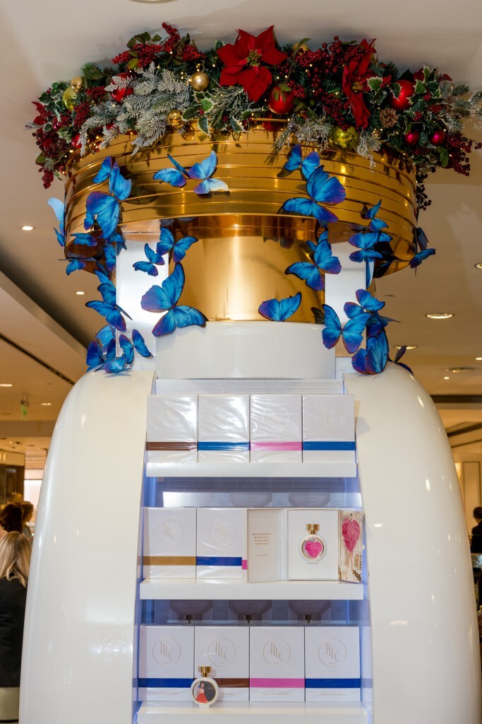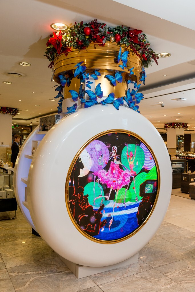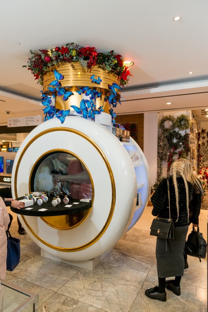 Украшенная объёмными аппликациями в виде бабочек и новогодними игрушками инсталляция в виде большого флакона HFC также оснащена экраном, на котором транслируется красочный рекламный фильм.