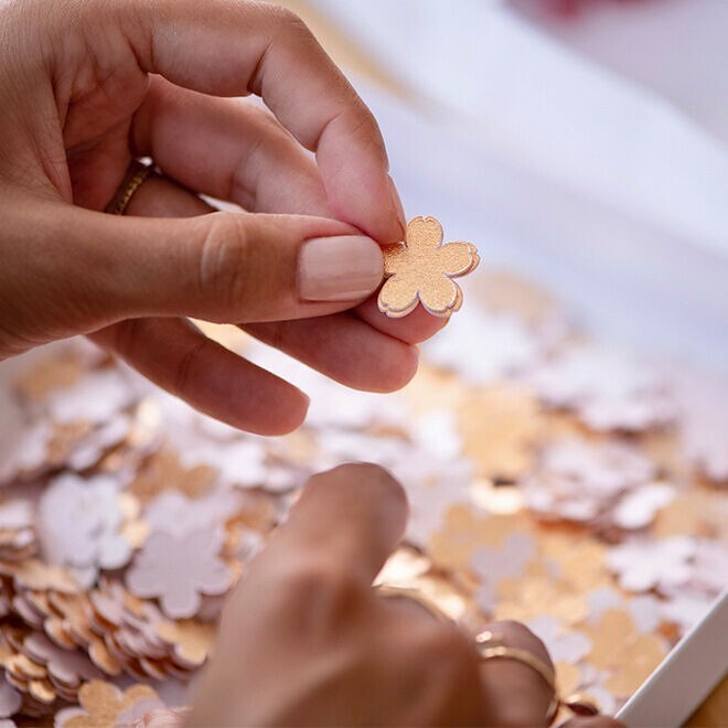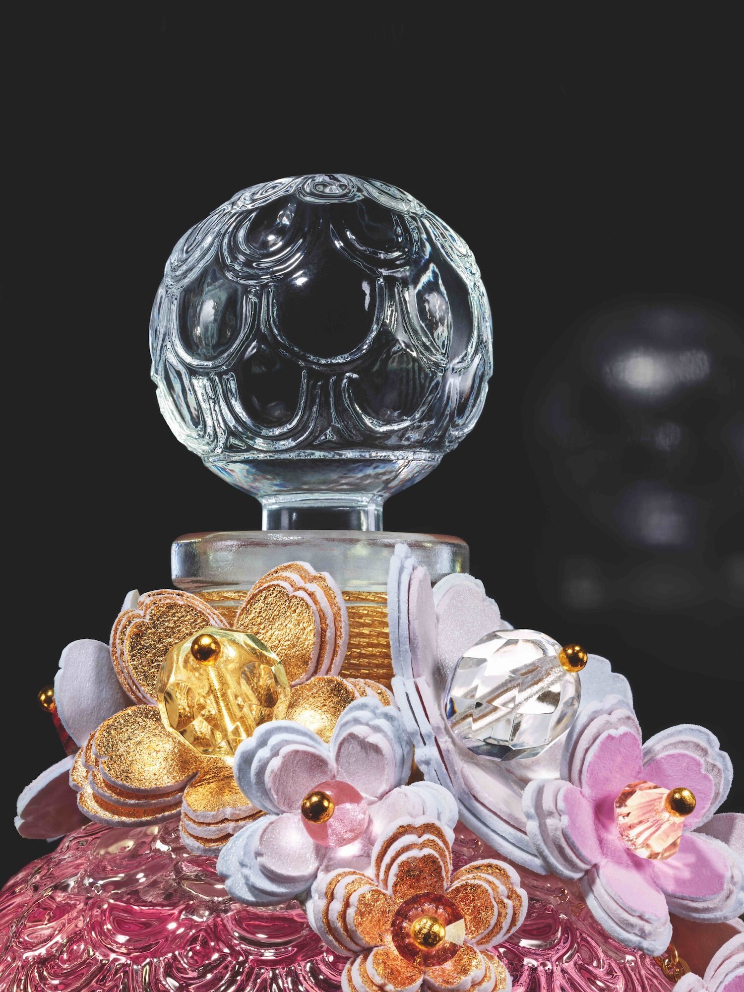 Стеклянный флакон Pochet du Courval увенчан украшением из цветов, созданным французским дизайнером Люси Туре — специалисткой по сочетанию бумаги с текстильными и ювелирными техниками отделки, обладательницей премии Prix Design Tour Eiffel 2019. Туре создала «цветы сакуры» из белой и розовой бумаги, дополнив их золотистыми штрихами. В центре каждого цветка — стеклянные бусины и кристаллы. Рукодельницы фабрики Guerlain украсили флакон веточным орнаментом и обернули горлышко золотой нитью.