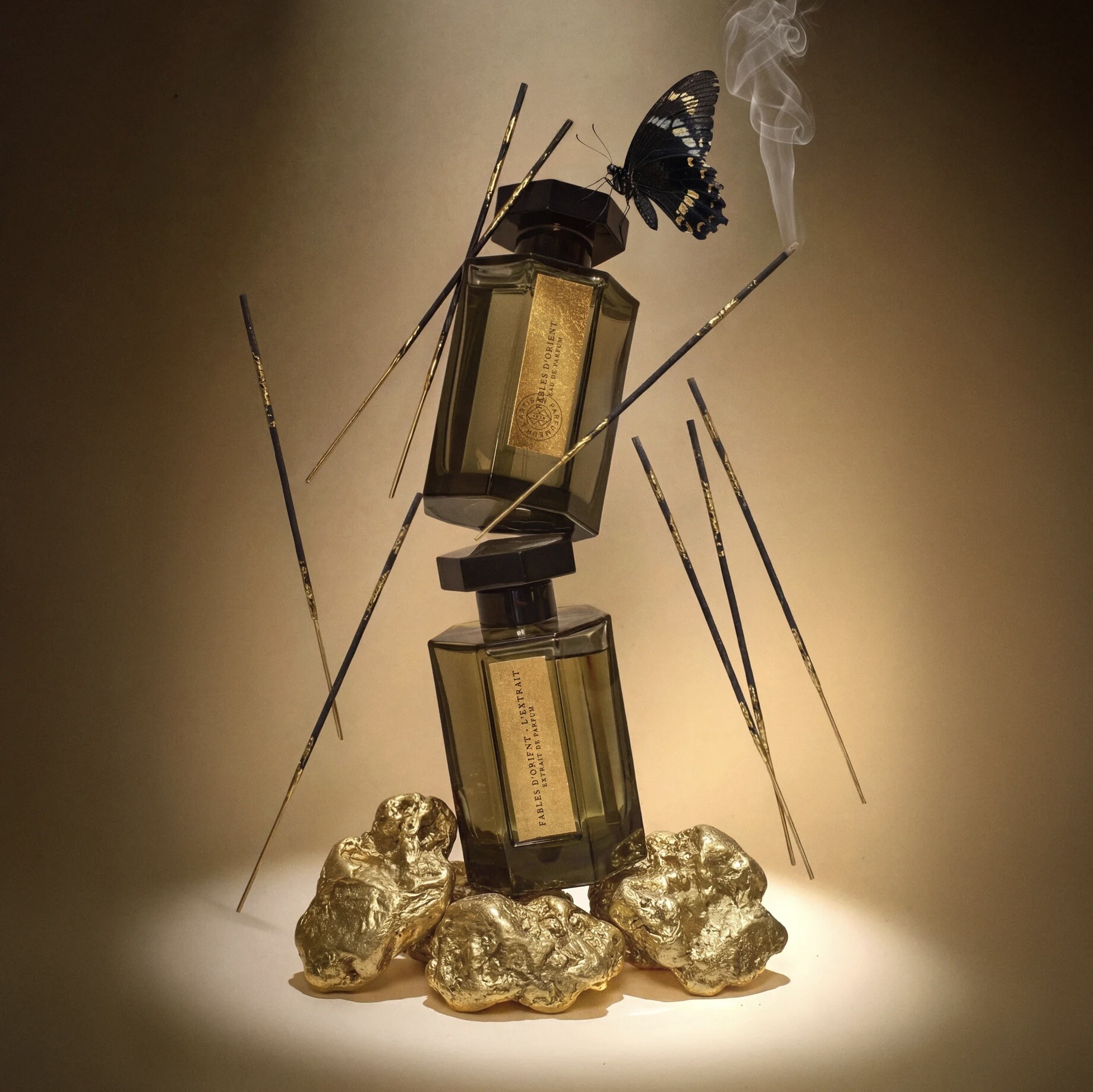 Оригинальный аромат Fables d’Orient включал в себя мягкие, цветочно-пудровые тона ириса паллида, поддержанного пряными нюансами мускатного ореха и обволакивающими нотами амбры и мускуса. Согласно выбранной концепции, акцент формулы Fables d’Orient L`Extrait смещён в сторону бальзамического звучания ладана, объединенного с амброй, контраст по отношению к которым создает искрящийся альдегидный аккорд.